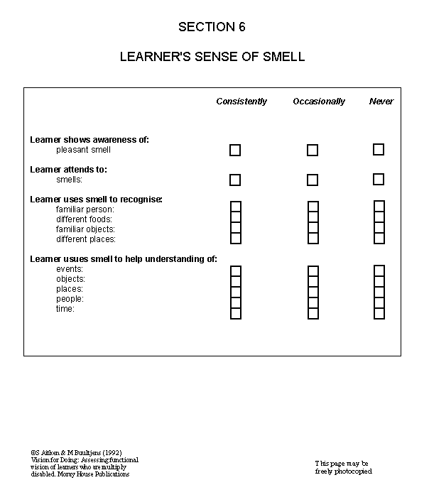 In the same way as you did in Sections 4 and 5, you will be using these headings to give some idea as to the learner's level of responsiveness to olfactory information about the world. This knowledge will help when selecting which of the intervention strategies are most relevant to your learner.