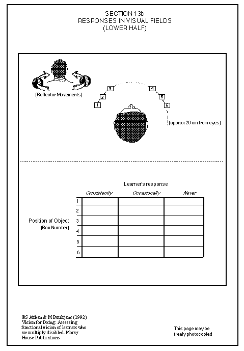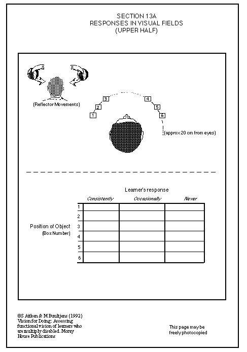 For most tasks, it is helpful to know whether a learner is seeing all positions or only certain areas of his surroundings. As we will discover, restriction of the visual field may result in only a small area at the centre in front of the learner being seen, with the learner not perceiving any position surrounding this central area. Or, as is common with learners who have severe physical disabilities, there may be certain areas of the periphery which are 'blank'.