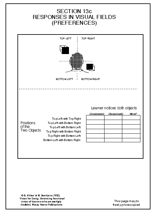 It is also useful to determine whether the learner has a particular visual field which is preferred. Objects may be preferred in one area over others. Refer to the diagram on the previous page. During the course of several sessions, place two items in two different quadrants in front of the learner. This is shown in the diagram above the dotted line in 13c.