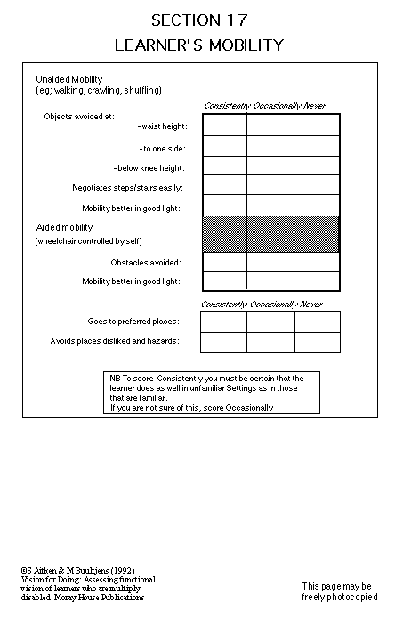 Such a definition does not restrict us to consider only those who can walk or run. It also encompasses those who are independently mobile but in a wheelchair: that is they themselves control the wheelchair. The items all bear upon some aspect of visual functioning. For instance bumping into obstacles may suggest an impairment to one or more areas of the visual field. Where obstacles are not avoided below knee height this may suggest a lower visual field defect. Refer to Section 13 to find out any other observations you made which support your conclusion.