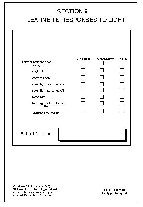 Refer to the checklist at the start of this section. Now you have to decide what the results of your observations mean for the purposes of curriculum development. You have to decide which boxes to tick in the Summary Chart (in Section 18). In that Summary Chart you will find that in the row for Section 9 there is only space to tick under Aware and Attend. The other three boxes are filled in. This is because any general response by the learner to light cannot tell us very much.